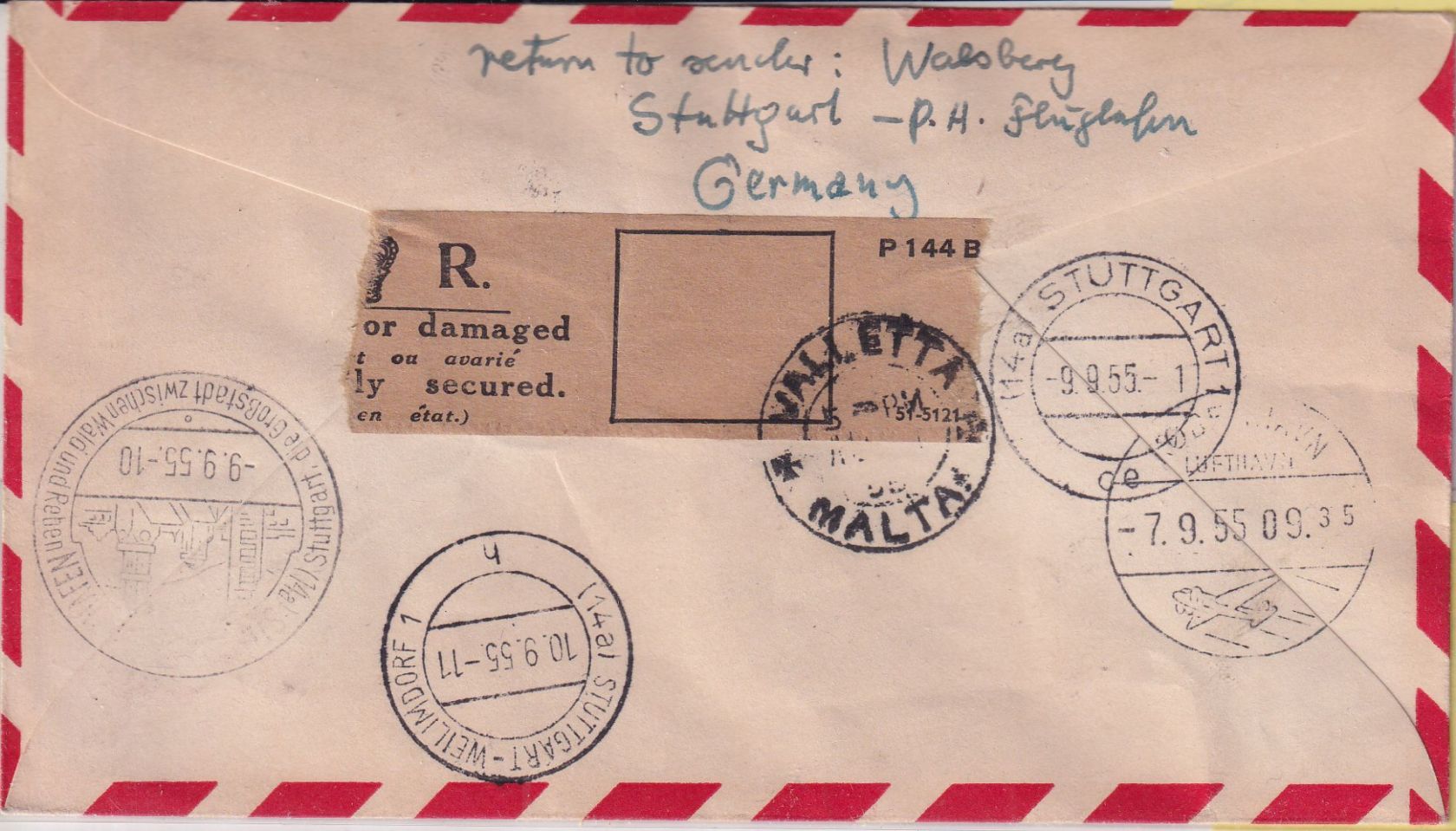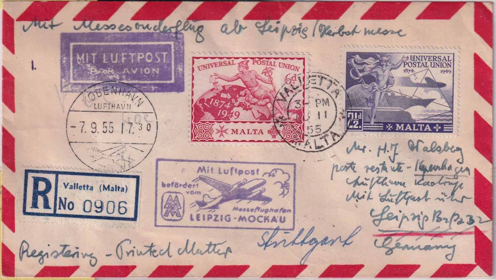 gelaufen als Luftpost-Einschreibe-Drucksache von Valetta n. Kopenhagne und weiter nach Stuttgart - seltene Variante - ohne Inhalt