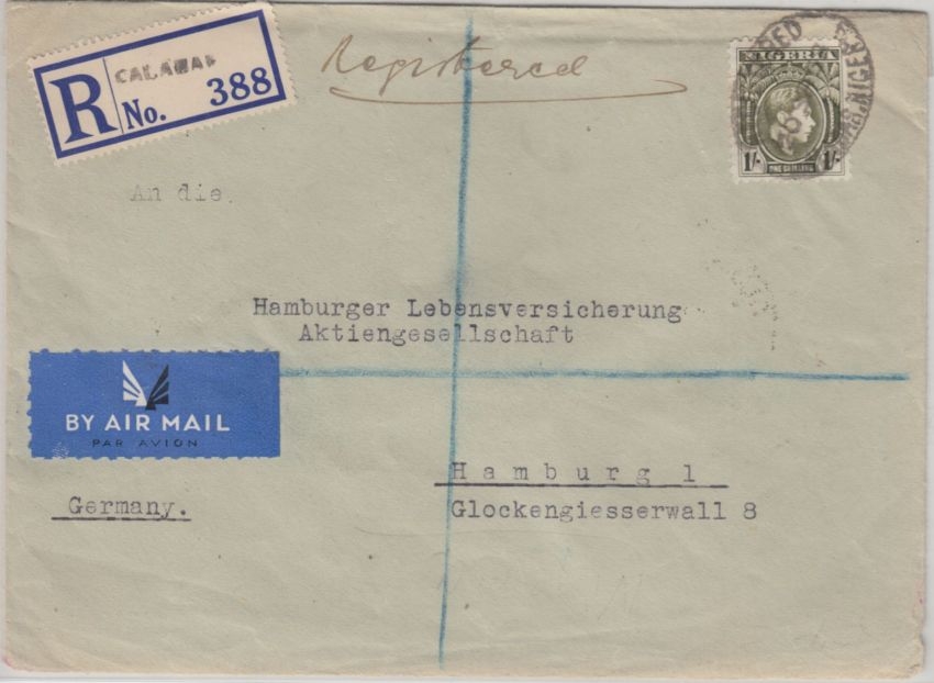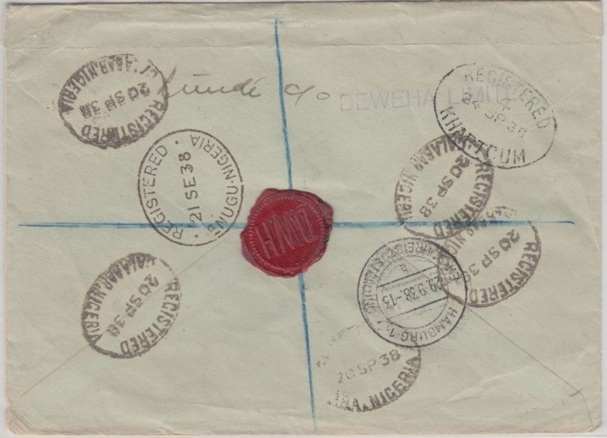 Leitweg: Enugu (Nigeria) - Karthoum (Sudan) - Hamburg Einschreibzustellung (!) - ohne Inhalt