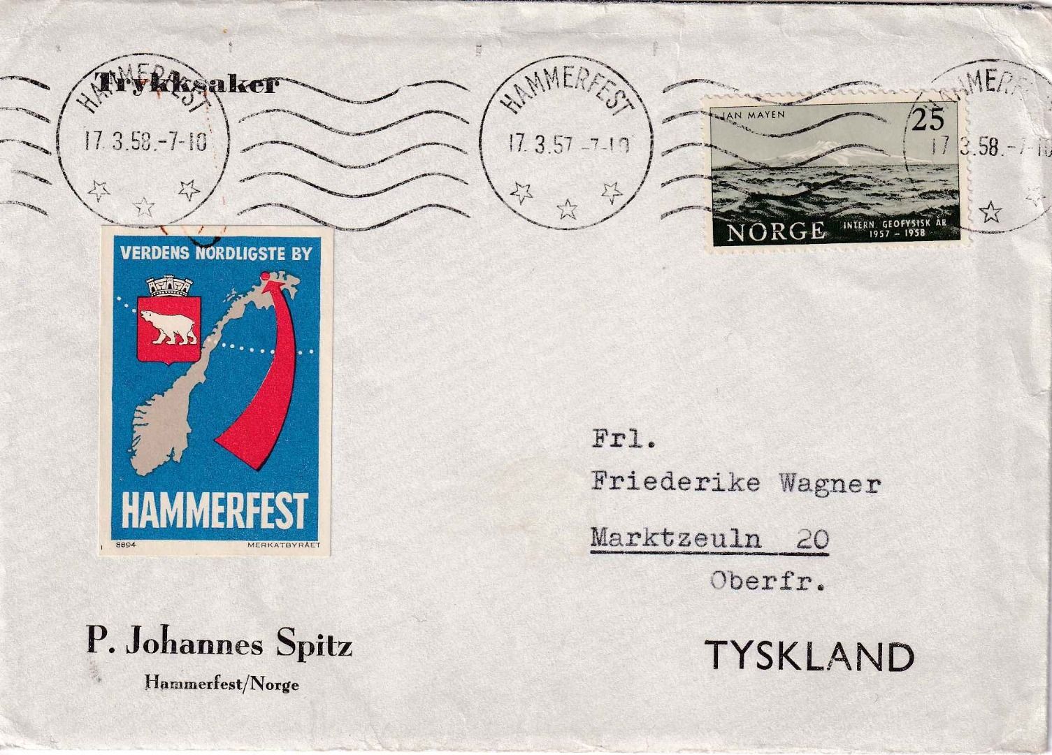 der mittlere der drei "Hammerfest"-Stempel mit falscher zahreszahl "57" statt "58" - mit Inhalt + Vignette