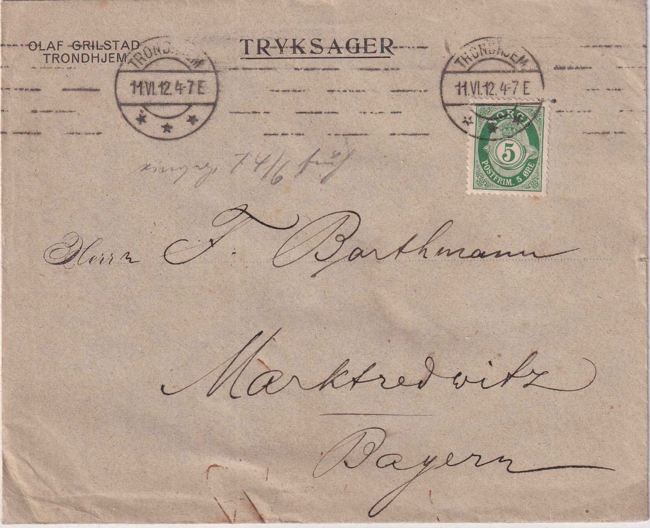 Norwegen - 5 Ö. Posthorn Drucksachenbrief Trondheim - Marktredwitz 1912