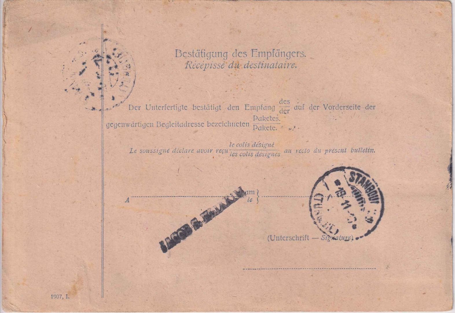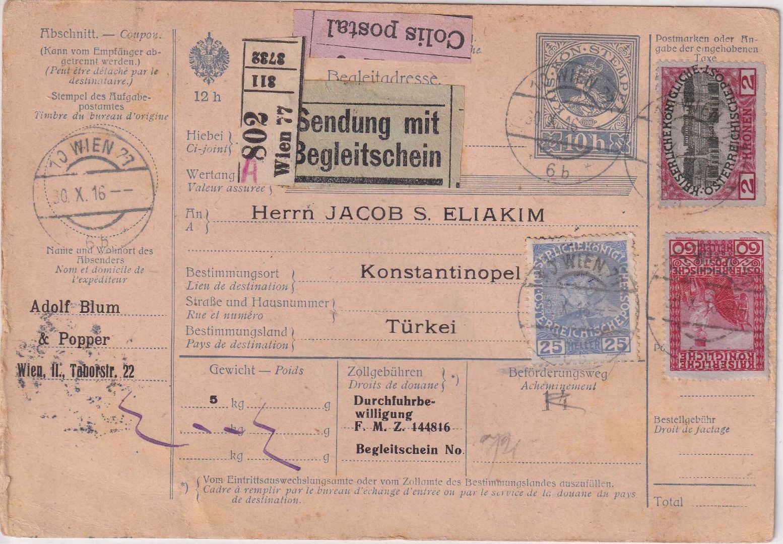Österreich - 2 Kr. Schönbrunn u.a. Paketkarte i.d. TÜRKEI Wien 30.10.1916
