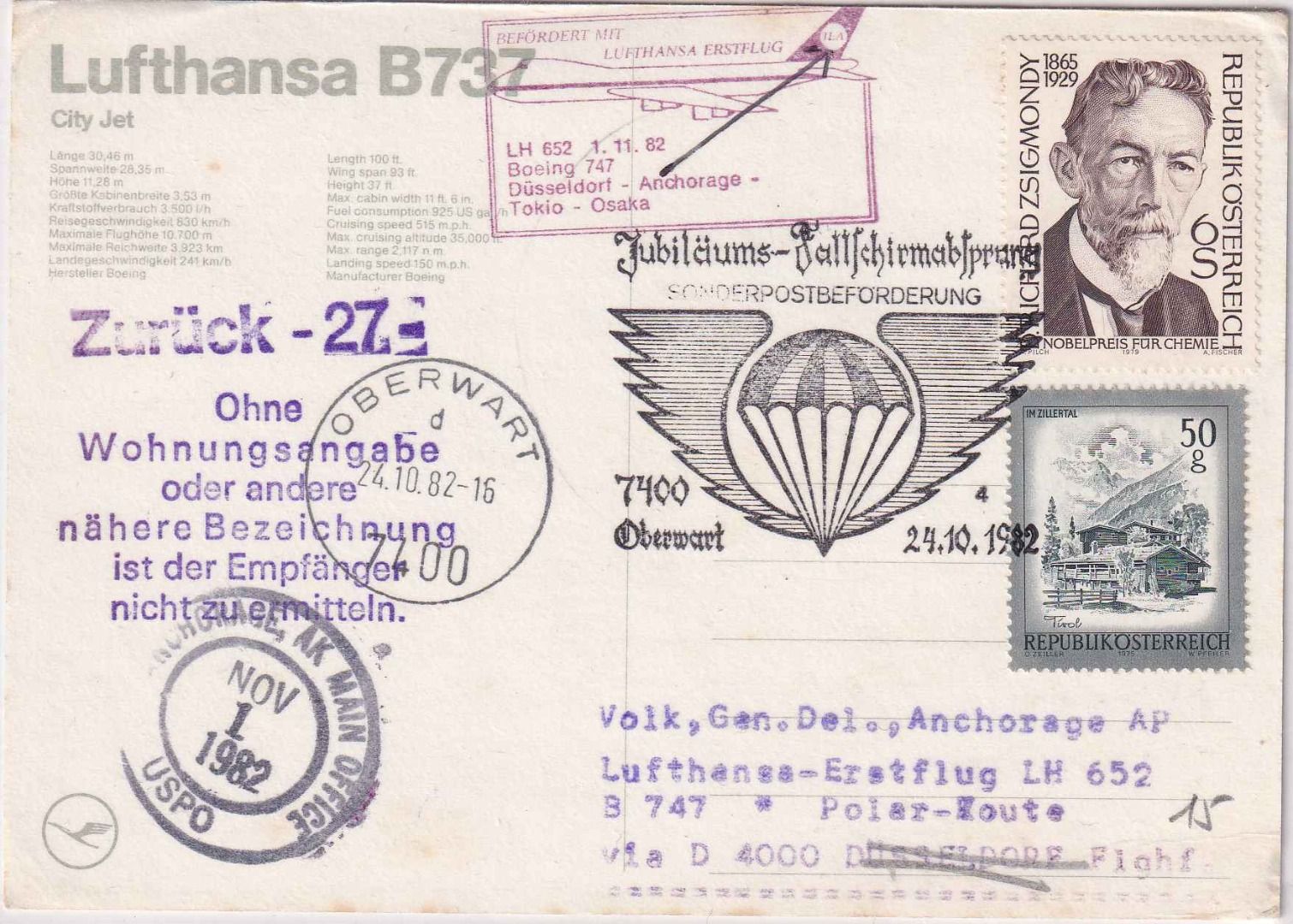 Zuleitungspost zum Lufthansa-Erstflug Düsseldorf-Osaka (Etappe Düsseldorf-Anchorage) - seltene Kombination !