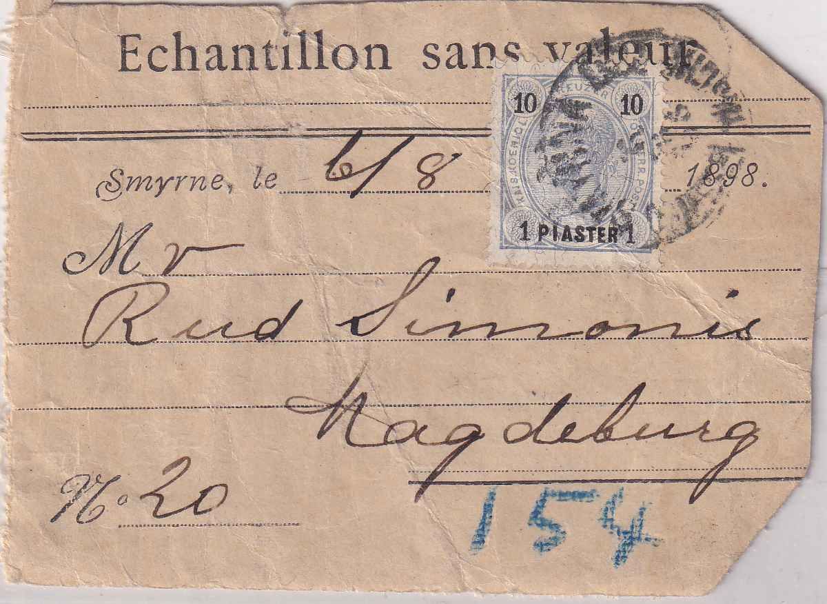 Österreich/Levante - 1 Pia/10 Kr. Muster ohne Wert-Vds. Smyrna - Magdeburg 1898