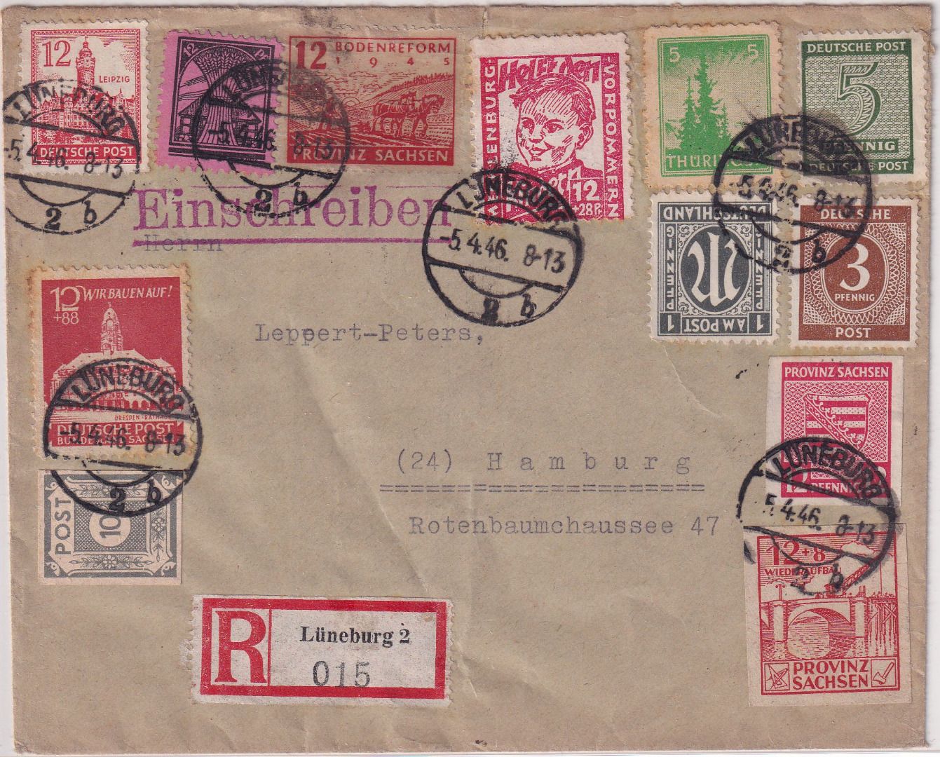 philatelistisch beeinflusste (geduldete) Mischfrankatur versch. Zonenausgaben - portorichtiger Einschreibebrief v. Lüneburg n. Hamburg (Ank.stpl.) - ohne Inhalt