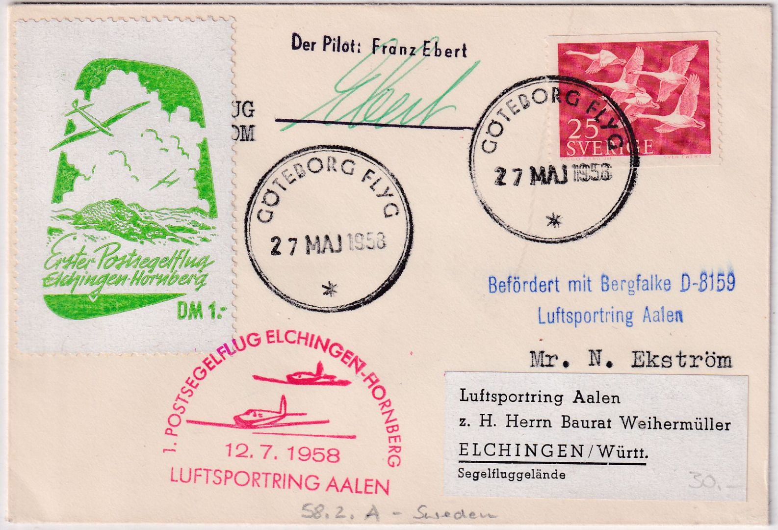 gelaufen n. Elchingen - Vignette, Cachets und L2 "Befördert mit Bergfalke..." und Piloten-Unterschrift