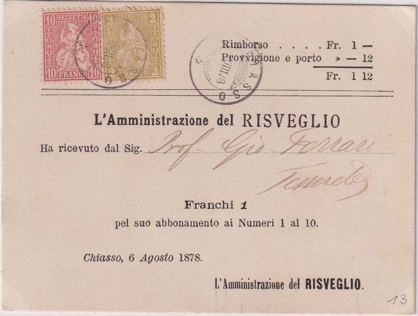 Schweiz - 2+10 Rp. sitz. Helvetia Nachnahmekarte Chiasso - Tesserete 1878