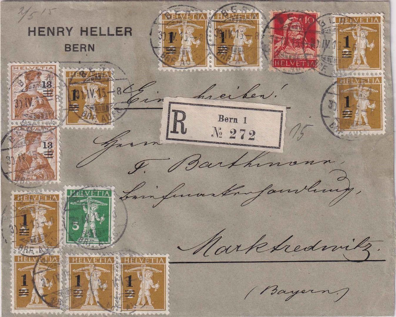 Schweiz - 2x13/12 Rp. Helvetia u.a. Einschreibebrief Bern - Marktredwitz 1915
