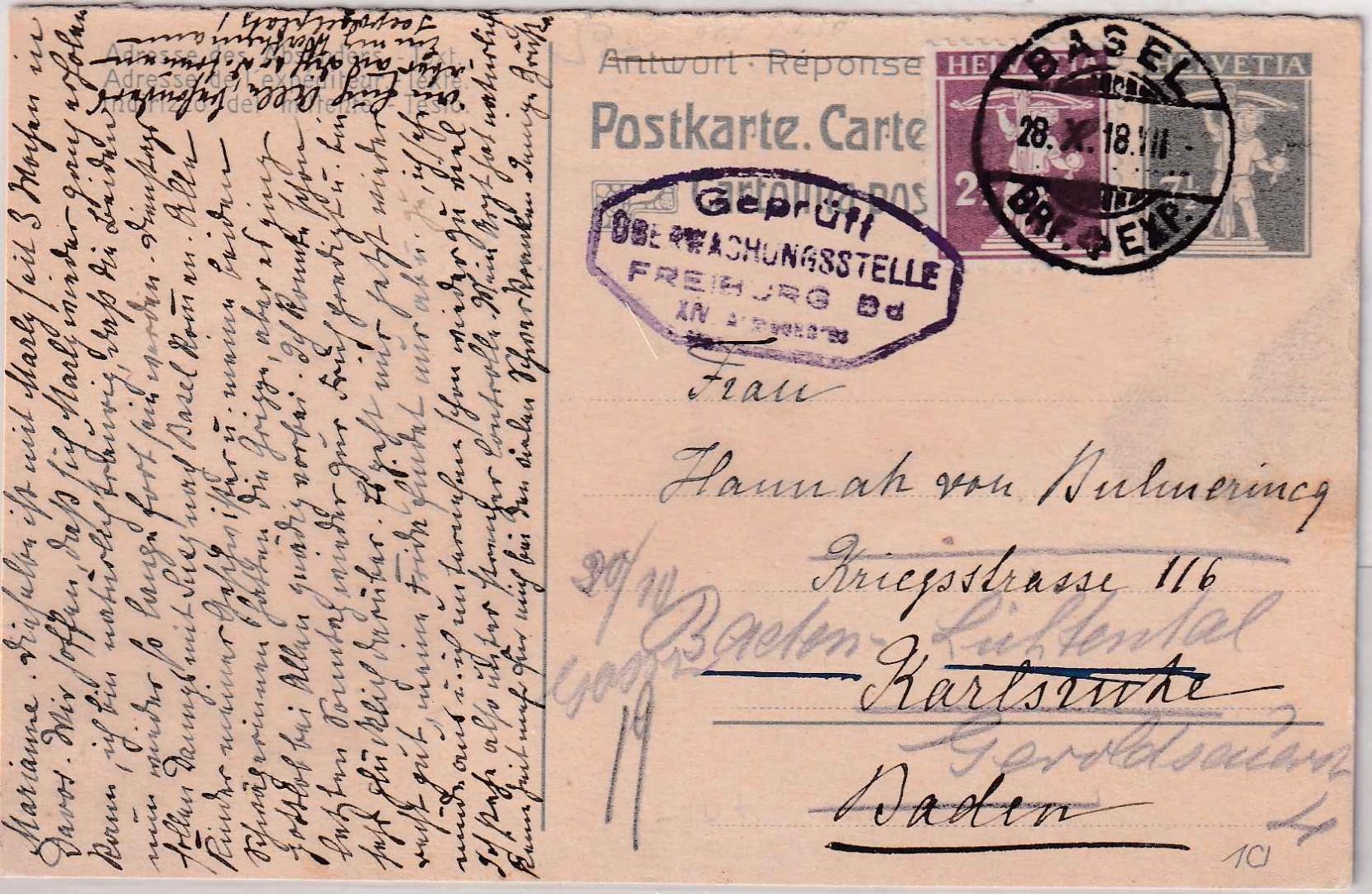 Antwortteil als Frageteil gebraucht - Zensurstempel Überwachungsstelle Freiburg - Nachsendung n. Baden-Lichtental