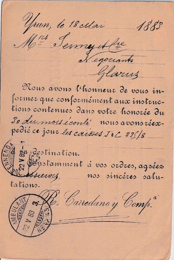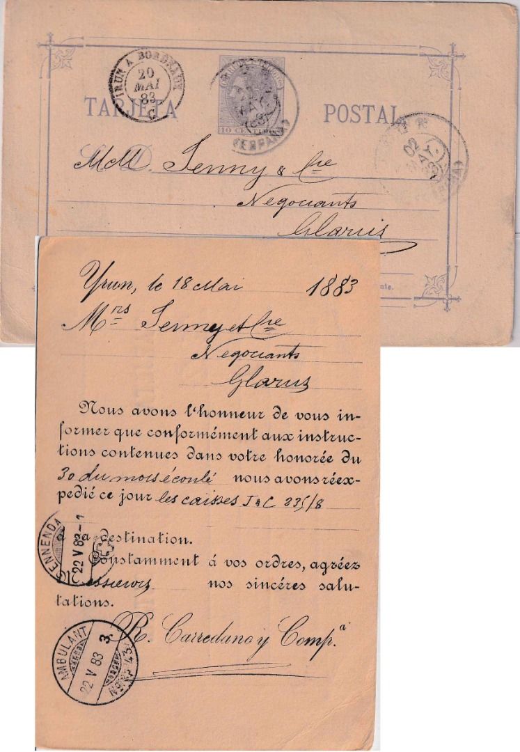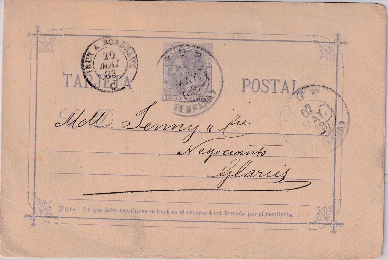 grenzüberschreitende Bahnpost (französisch) Irun-Bordeaux - rs. schweiz. Bahnpoststempel - rs. priv. Zudruck