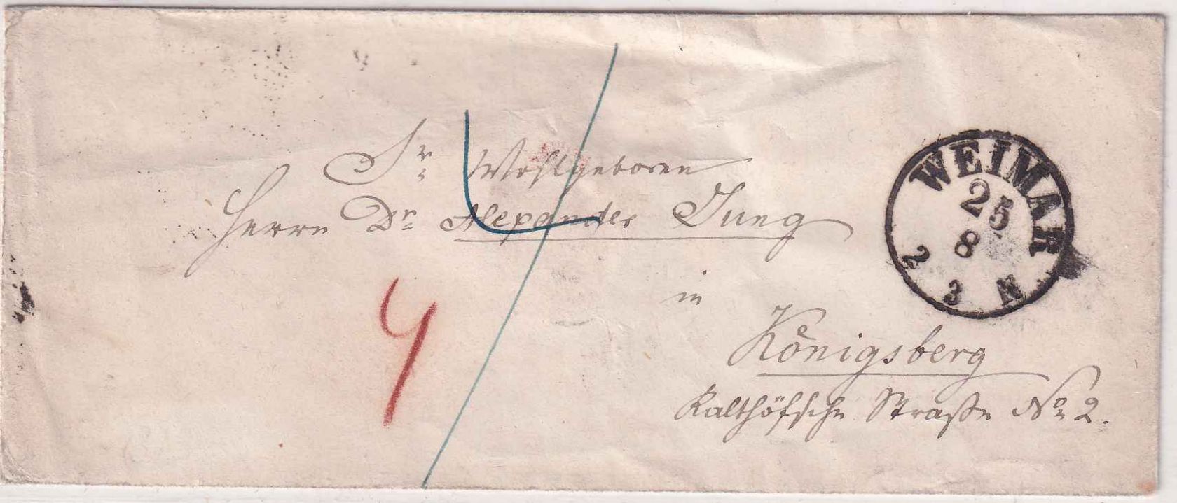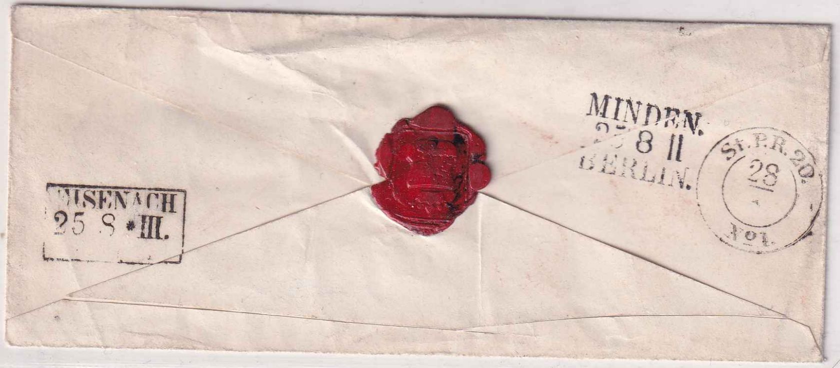 rs. u.a. preuss. Bahnpost-L3 Minden/Berlin - adr. an Dr. Alxander Jung (*1799 +1884 dt. Publizist, Literaturhistoriker, Erzähler u. Lyriker) - ohne Inhalt