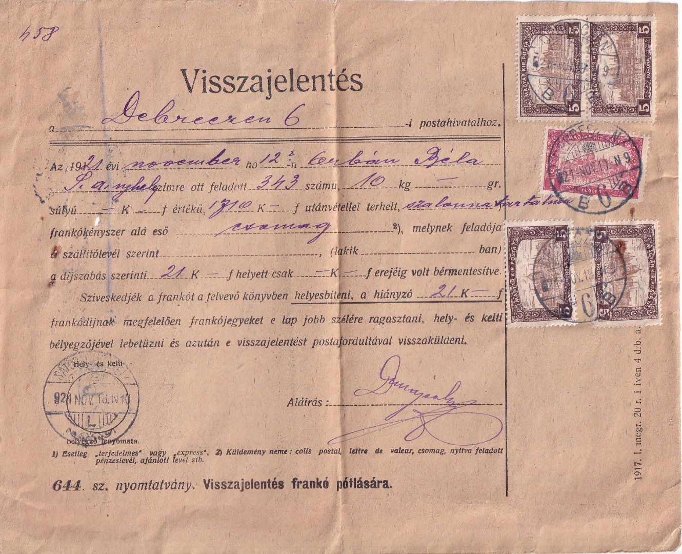 Ungarn - Debreczen 1921 Nachnahme-Paketkarte + Portonachforderung RRR!