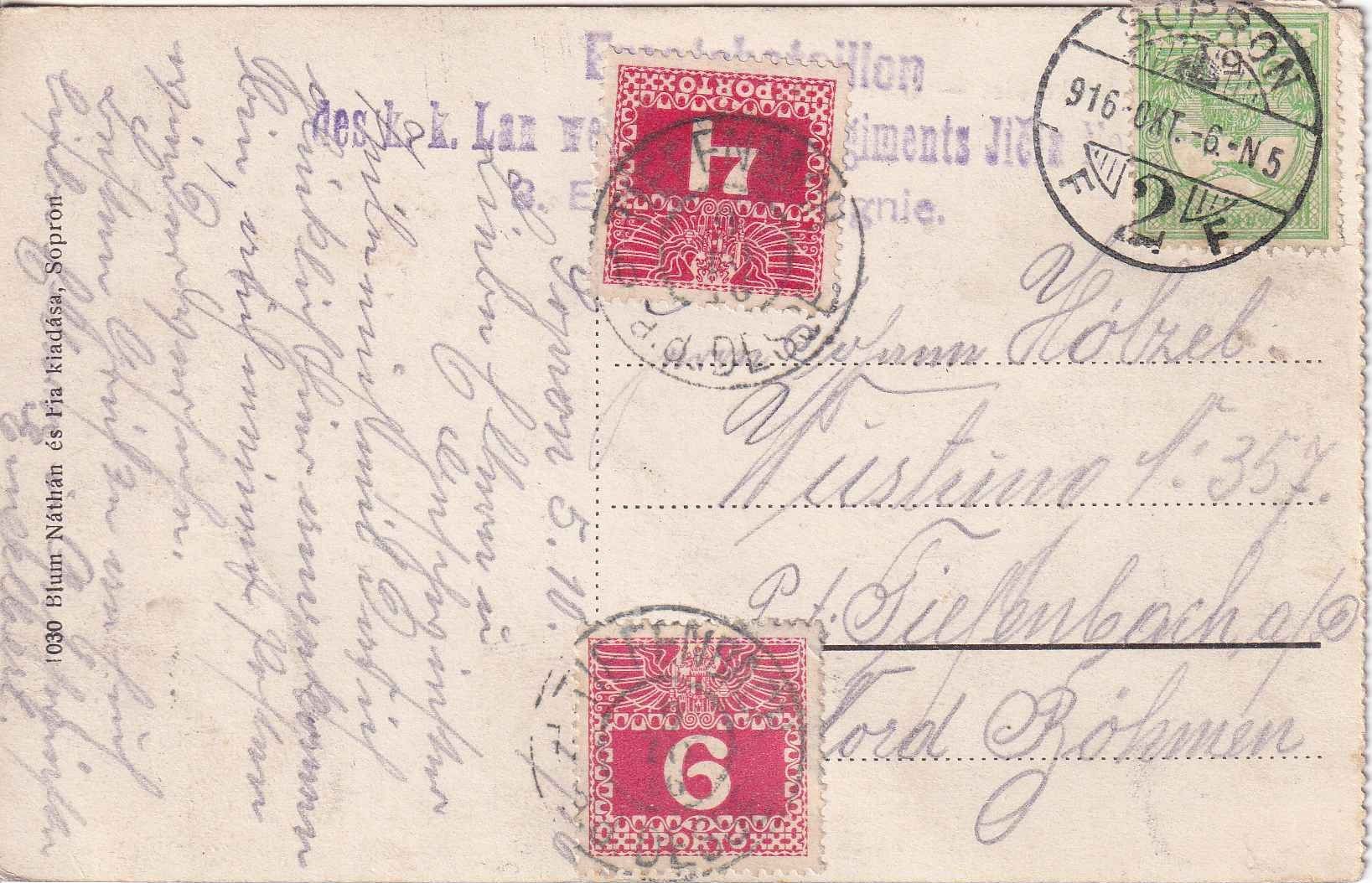 Ungarn/Österreich - 5 F. Turul Feldpostkarte n. Tiefenbach 1916 Nachporto
