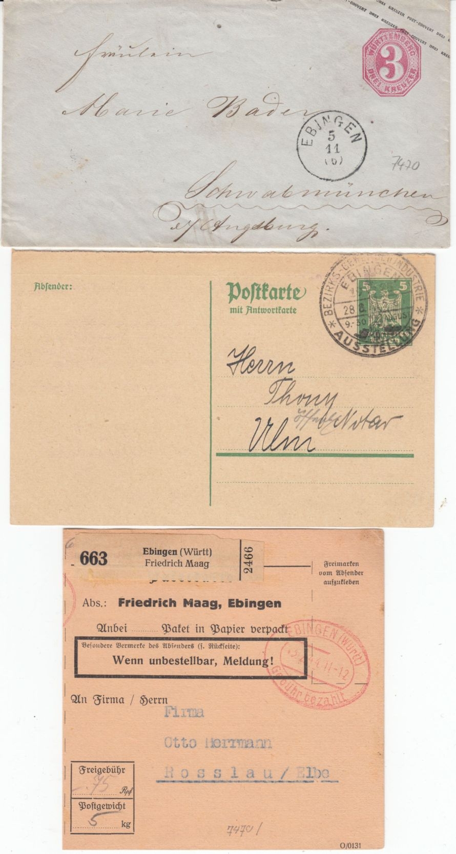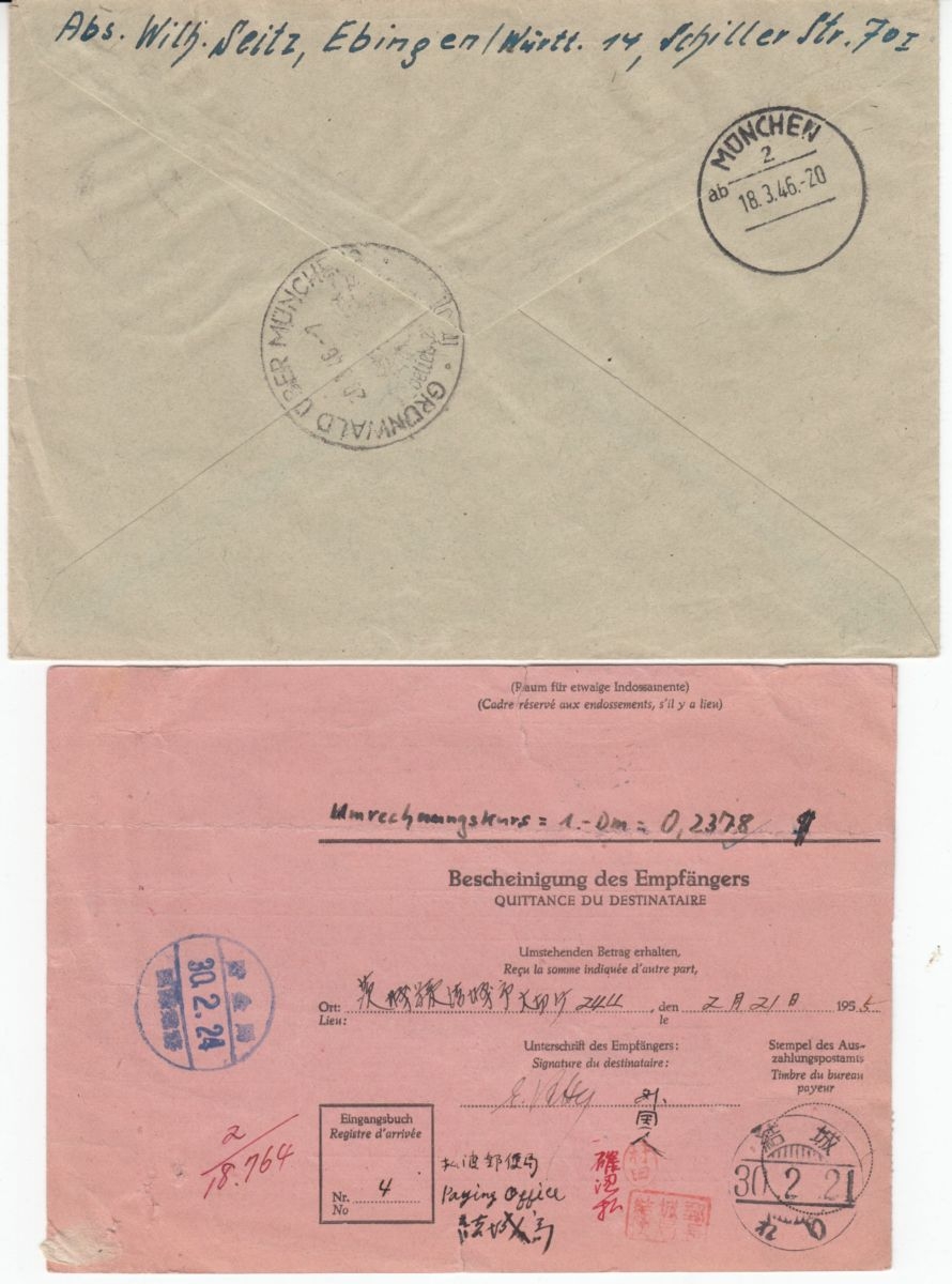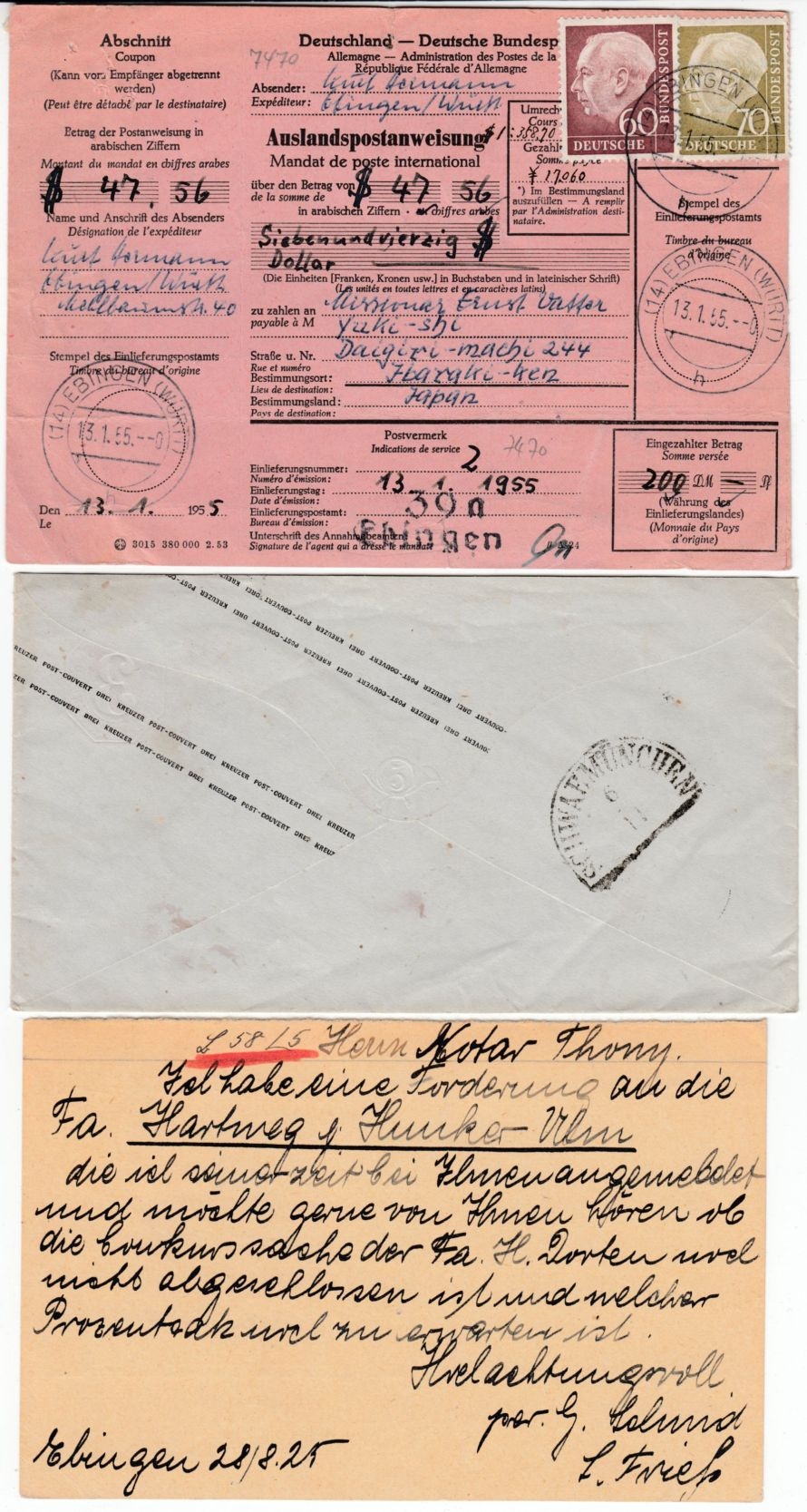 darunter: 3 Kr. GA-Umschlag n. Bayern, Gebühr bezahlt, Selbstbucher-Paketkarte, Postanweisung nach JAPAN (!!) - durchwegs saubere Erhaltung